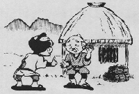 村の人達は庚申塚(こうしんづか)の大きな榎(えのき)の根もとに小さな供養塔(くようとう)を建てました。余八は三才でしたが、おばあさんに育てられました。父母がいない為、暮らしは楽ではなく、苦しみの連続でした。けれども余八は、おばあさんの言いつけはよく聞き、自分で出来る事は、どんどん手伝いました。おばあさんは、うすで、そばや、豆、いり粉をよくひきました。天井から竹ざおをぶらさげ、うすの柄にはめ、根気よく廻しました。余八も竹を握り、おばあさんの歌にあわせてひくのでした。